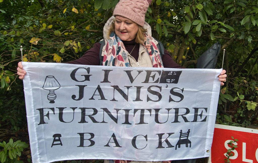 In order to minimise the space available for protestors to congregate near their UK headquarters, the Church of Scientology placed a number of illegal obstructions along Saint Hill Road. This included planters, which blocked the public right of way and 105 holly bushes on the opposite side of the road, leading to pedestrians and dog-walkers to navigate dangerous obstructions in a dark and narrow country lane.